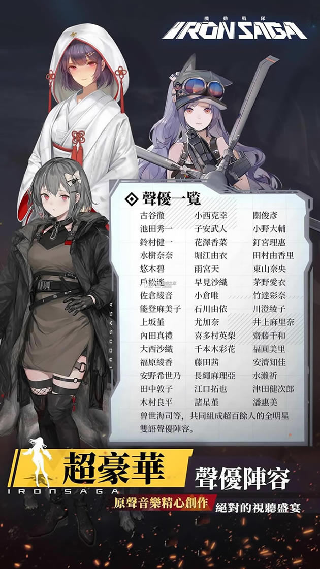 用诚意做游戏,用心做音乐。我们特别邀请了知名作曲家、编曲家【泽野弘之】先生(代表作: 机动战士钢弹UC、罪恶王冠、进击的巨人等)担当OP、ED、BGM配乐。著名动画师、动画监督、机械设定师【大张正己】(代表作: 弾劾凰,超级机器人大战,钢弹创斗者系列,机动战士钢弹 铁血孤儿等动画)担当机甲设计与以及PV动画监督。