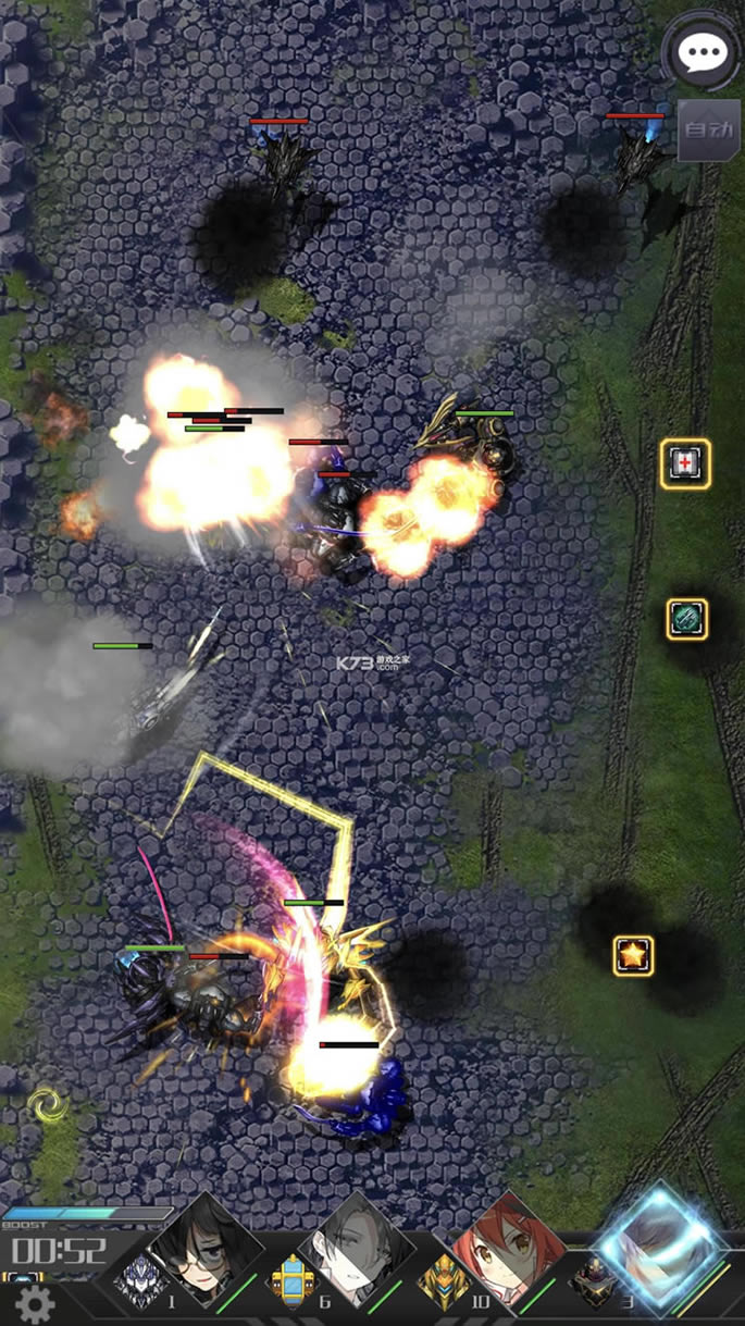 游戏玩法上,玩家可以控制四个机甲组成的小分队,在宏大的世界观中探索宿命,爱情与友情。在战役中,直接拖拽单位可以移动他们的位置,比如将擅长格斗的机器人顶上前排,或者将擅长回血的飞机拉回后方以作保护。或许“手残党”可以完全无视,只需要把握技能释放的时机,因为机甲搭载的驾驶员也具有一定的AI操作能力,选择相信她们的自由移动,在推关中也是不错的选择。但是在挑战模式中,玩家只能操作一个机甲单位上阵应付各路BOSS,走位就显得尤为重要了。除此之外,还有塔防、攻城等其他玩法的副本逐渐开放,让日常的练级变得饶有趣味。