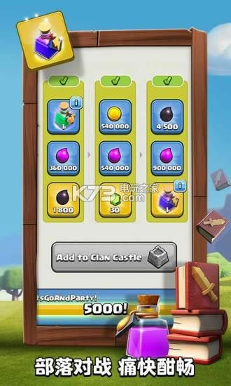 用全新兵种进行对战,包括狂暴野蛮人、隐秘弓箭手、巨人拳击手、加农炮战车以及新英雄——战争机器。