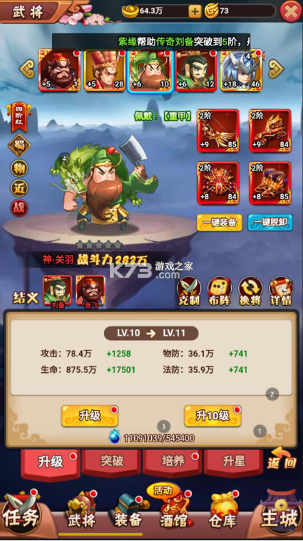 武将突破:消耗突破丹和同品质的武将卡,可进行突破,获取大量属性提升。
