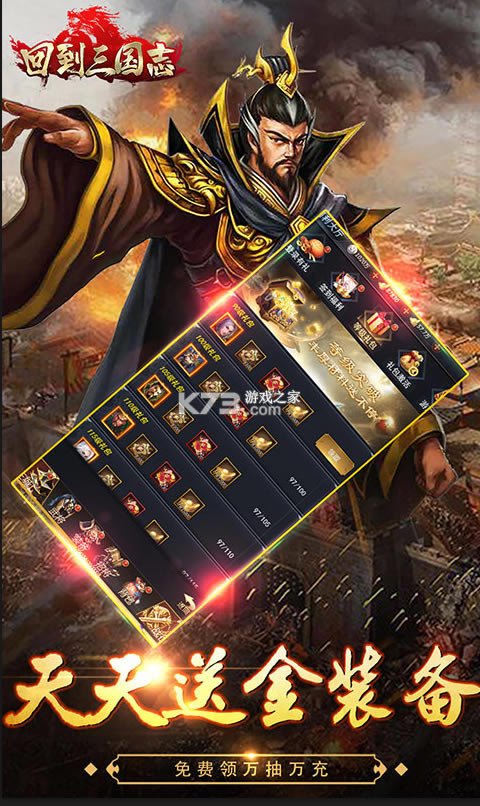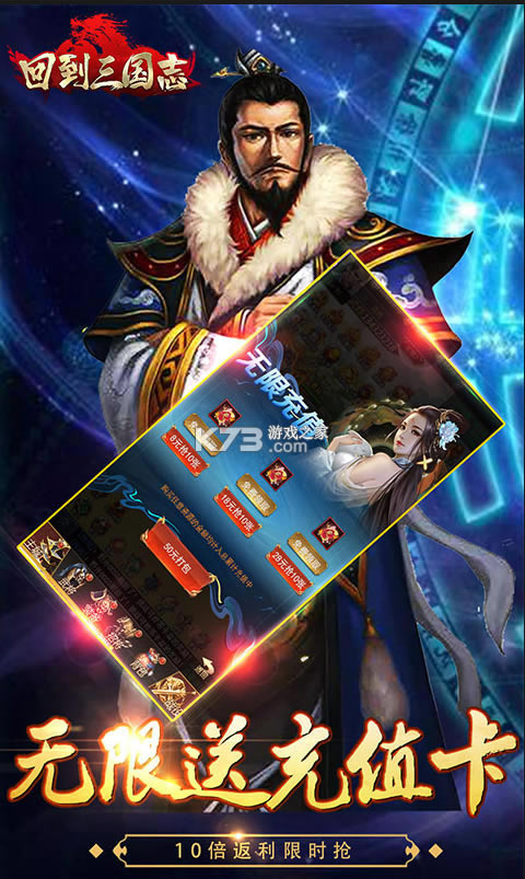 《回到三国志》毕业级的商城,全部免费来开启,送万元真充卡和万抽道具,无限永久免费送充值卡,天天送金装无限送充值卡,N多超爽的福利等你来领取,招募三国排兵布阵开启乱世枭雄,最终统一三国的霸业。