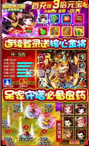 《新塔防三国》是一款萌系塔防手游,将三国历史上叱咤风云的人物,变化为一座座有爱的防御塔。游戏上线即送VIP15、元宝5万、银两50万,充值卡每日免费抽,最高价值1000元的充值卡,元宝天天有,一直白拿一直爽