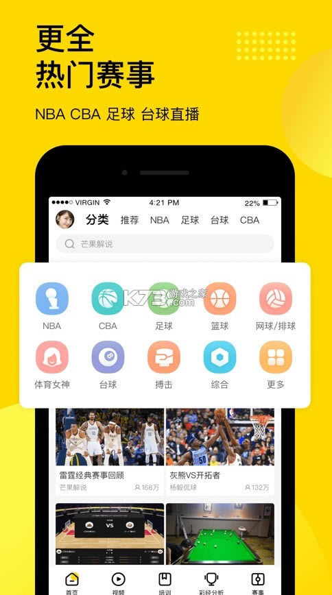 6、体育分类:NBA,篮球,足球,台球,乒乓球,网球,羽毛球,健身,舞蹈,赛车…,每一个体育分类下,均有主播在做体育直播