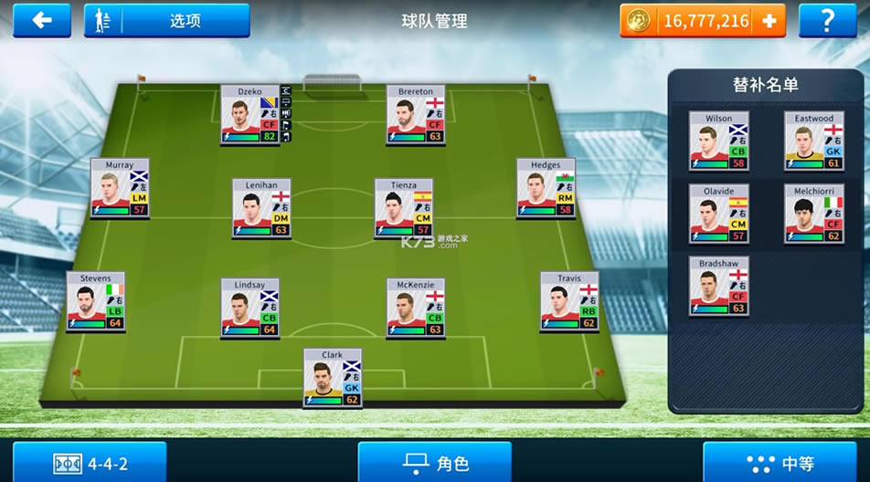破解内容:无限金币提供,可以免费购买所有球员、球衣(进入游戏即可修改语言为中文,点击左上角选项,选择游戏设置第一栏select language,选择倒数第三个中文)