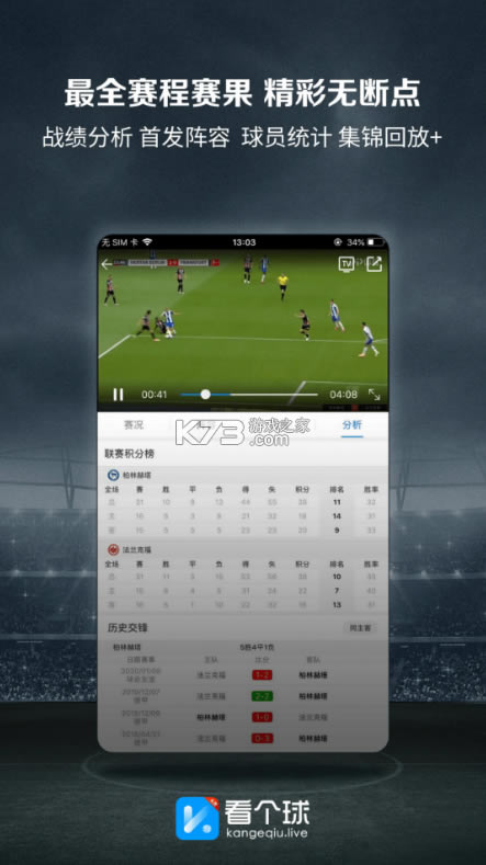 看个球app官方最新版是一款好用的体育赛事直播软件,可以在线观看nba等精彩的赛事节目,目前软件还为大家上线了直播回放功能,让你能够会看错过的比赛内容,海体育赛事直播,最新的赛事比分进程和消息,尖锐犀利的赛事评论等等,喜欢看比赛的赶紧来下载吧。看个球App是一款非常不错的关于新闻发布比赛的平台,为用户提供各种精彩的足球的比赛信息,让你可以看到最专业的数据报表分析,体验球迷会的互动,参与多样化的足球赛事的竞猜,还有各种实物的虚拟,喜欢的朋友们下载试试吧!