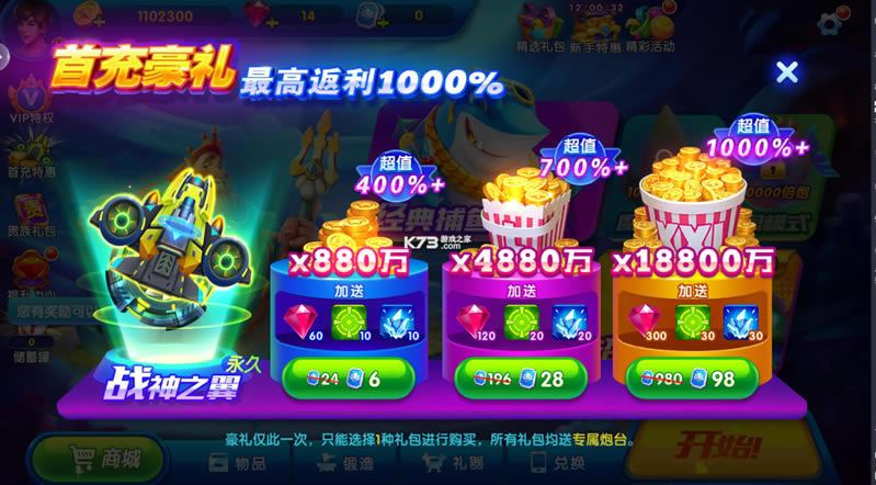 解锁炮倍更轻松,锻造让您百万炮倍不是梦!更有全新炮台不朽战神,让您即刻两百万倍炮的超强快感!