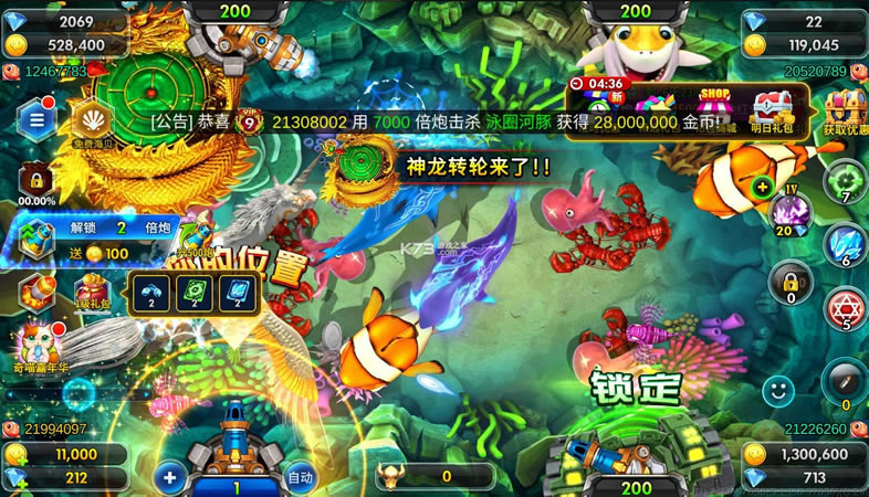 2、多种特殊鱼玩法,雷霸龙、神龙转轮、烈焰风暴、狂暴海王、钻头蟹、闪电鲨、炸弹蟹,暴富无上限!