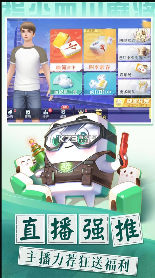 一款全新设计的四川玩法版麻将对弈手游。游戏全新版本上线,福利超多,年度礼包,胜利红包,还有各种精彩活动,让你一战嗨到底,血战模式,就像四川小吃一样,带着火辣辣的刺激感,风云迭起、胜负难判,大大提高了川麻的趣味性。