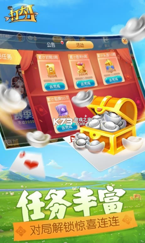 《打大a下载安装》是一款好玩的纸牌游戏,采用了非常经典的打大a玩法,玩家可以自由的去选择不同的玩法,有排位赛还有经典场模式,融入了内蒙古的元素,有蒙古当地的玩法。