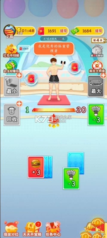 《体重大挑战红包版》题材非常新颖的趣味红包手游,游戏中玩家们将控制角色进行减肥,重拾苗条的身材,完成各种任务即可获得红包奖励,不仅能学习各种健身知识还能赚取丰厚的红包福利。