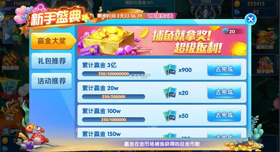 《捕鱼街机》进入游戏中就能体验新手的豪礼,包含了全新的游戏盛典,捕鱼就拿奖领取超值的返利,累计赢金3亿就拿话费,20w和30w金币领的就越多,福利超级多活动也超丰厚,长时间来按放出技能吧。