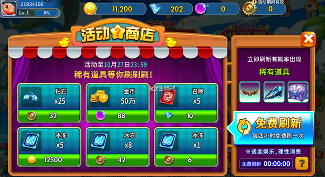 活动商城:稀有道具等你刷,每4个小时刷新一次钻石和宝珠以及金币等来兑换金币、钻石和召唤、冰冻