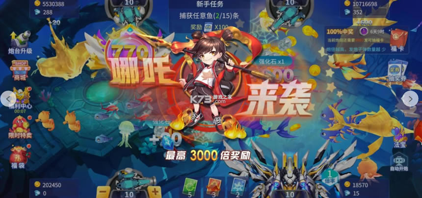新手7日游戏礼包大放送,每日福利活动不断,道具奖励、金币奖励赢不停!爽爽爽,轻松捕鱼,爆爆爆,一炸清屏!等你来开炮哦!