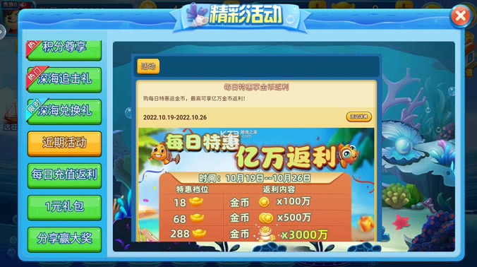 特殊捕鱼渔场场次掉花色,花色组合每日可赢实物大奖。