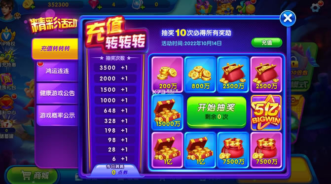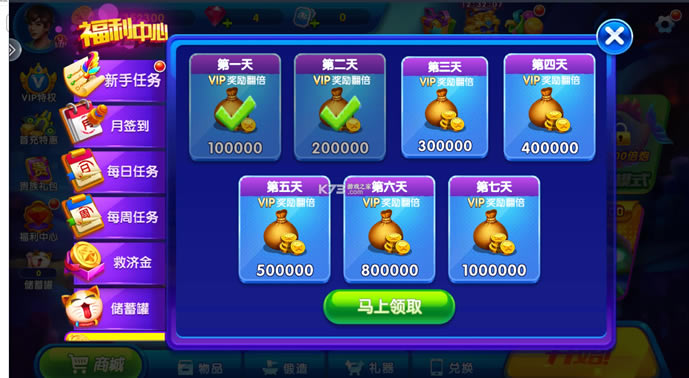 登录商城领取暖心礼包10w金币,在月签到领取钻石和金币,每天登录每天都领,每日任务活跃就领钻石,捕鱼获得1百万金币就领,连续登录金币奖励多,连续就翻翻,领取7天就结束。