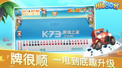 升级80分是一款棋牌类游戏,升级80分手游是一款风靡全国的经典扑克牌游戏。牌局采用四人组队抢分升级的游戏模式,超炫酷的画面配备相当烧脑刺激的玩法,新一轮欢乐升级决斗风暴即将开始,准备迎战吧!升级80分游戏是国内非常盛行的一种 4 人扑克牌游戏,升级80分手游可以选择一副牌、两副牌或者三副牌进行。打一副牌时,也称为 "40 分 " 或 "打百分 " ;打两副牌时,也称为 "八十分 " “摔小二”;与斗地主、跑得快等游戏不同的是,更注重抢分的策略性;升级的特色四人结对竞赛、输赢升级的模式,后续衍生成了“掼蛋”这种新玩法。