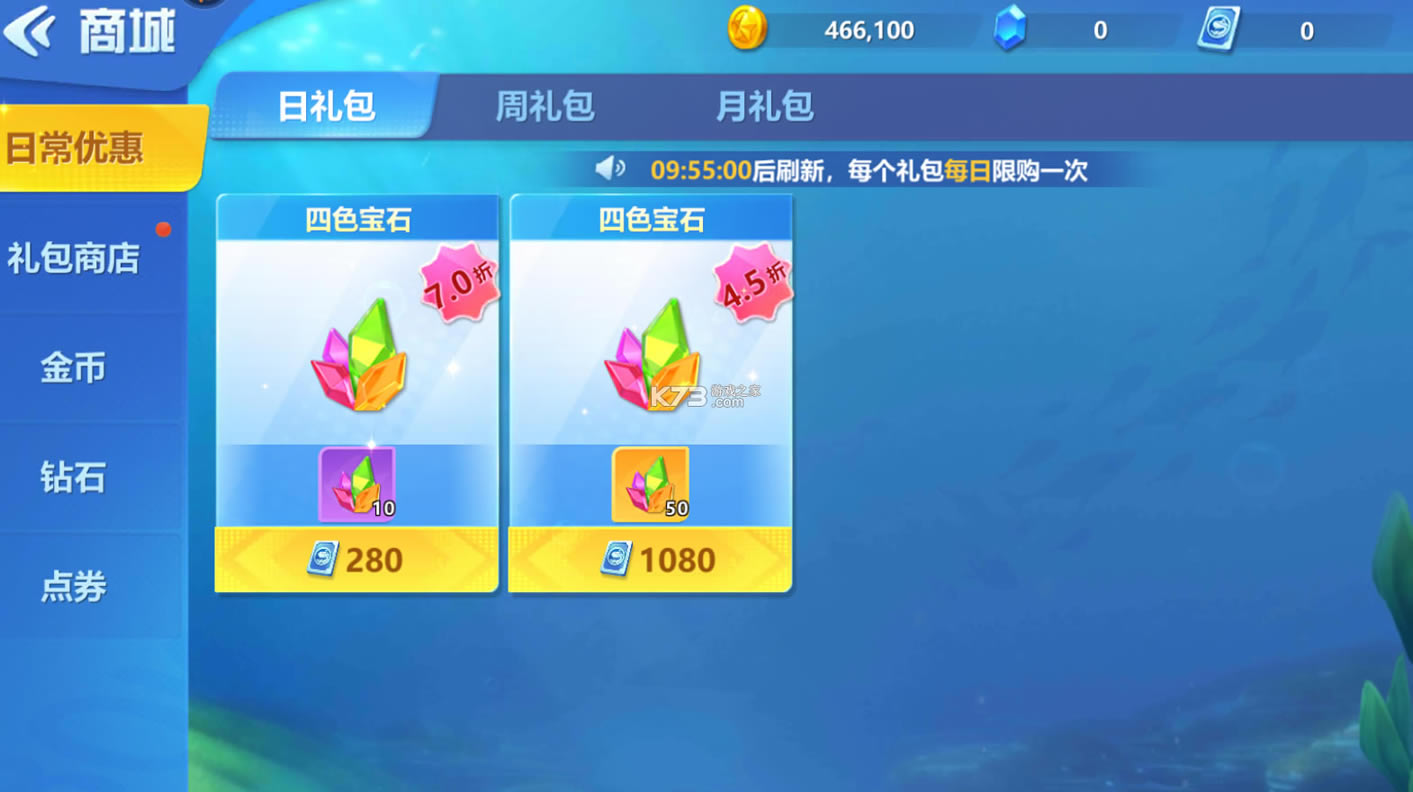 《捕鱼大世界》包含了经典的模式和新手海湾以及远古祭祀等,在这里包含了特惠豪礼和限时礼品,在商城中购买给与超级高的折扣优惠,在海底点击捕鱼升级炮倍领取点券,抽渔券,兑换更多的商品。
