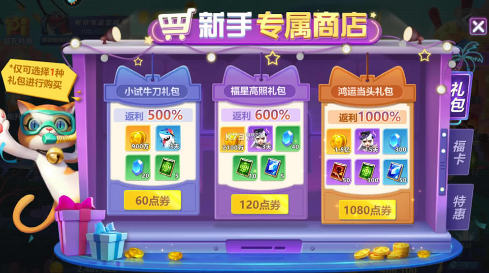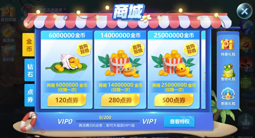 远古祭坛房间全新上线,5条全新特殊鱼奖励加倍,远古石灵BOSS,祝福增益玩法,带来全新游戏体验。幻境闯关新增号角召唤功能,VIP4之后开启VIP补给箱玩法,最高可开5亿金币,商城新增648元钻石礼包,返利高达30%。