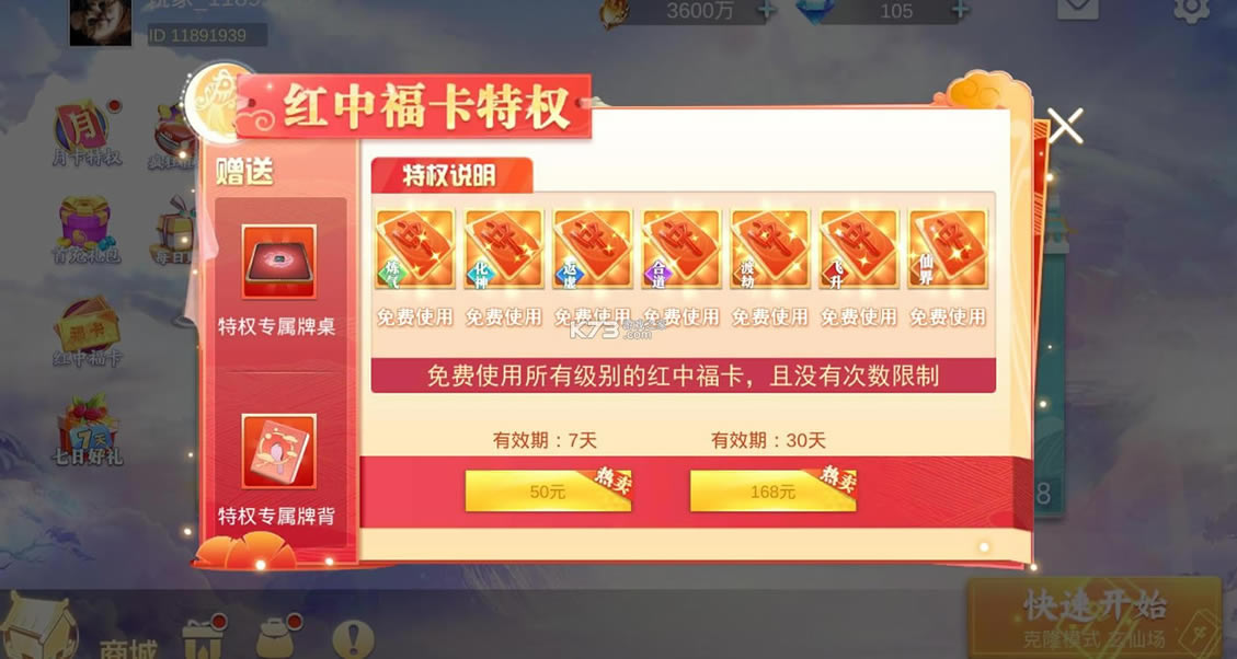 红中福卡特权说明:免费使用所有级别的红中福卡,并且没有次数的限制,有效期有7天的50元有效期30天180元,红中福卡包含了炼气和化神、返虚、合道、渡劫、飞升、仙界。赠送专属的牌桌和特权专属背牌。疯狂模式在系统维护中,敬请期待。
