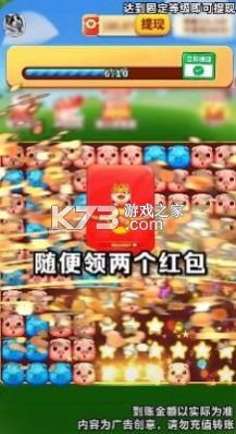 小猪旺旺财真的能赚红包吗,这款猪猪消消乐游戏玩法经典,只要三消闯关就送红包,红包秒提,随时消除打发时间,还能赚零花钱,推荐玩家体验。