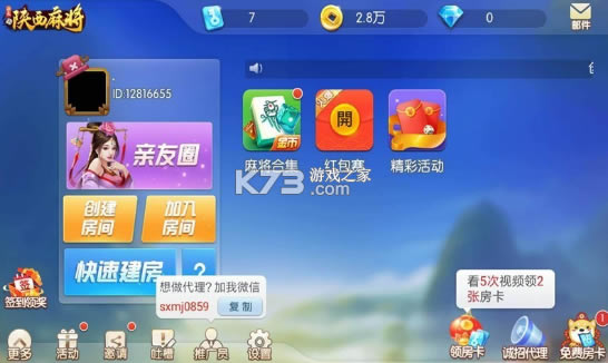 1、进入丫丫陕西麻将之后,按照指定的要求去刷游戏就行。