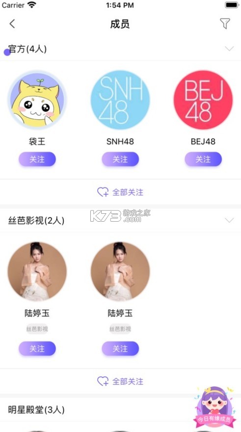 《口袋48官方版》是一款专为女子偶像天团SNH48打造的app,在软件中全部都是关于这个团体的各种资讯,通过这款软件可以来了解他们的各种行程和活动,还可以观看他们的直播,还有各种视频等。