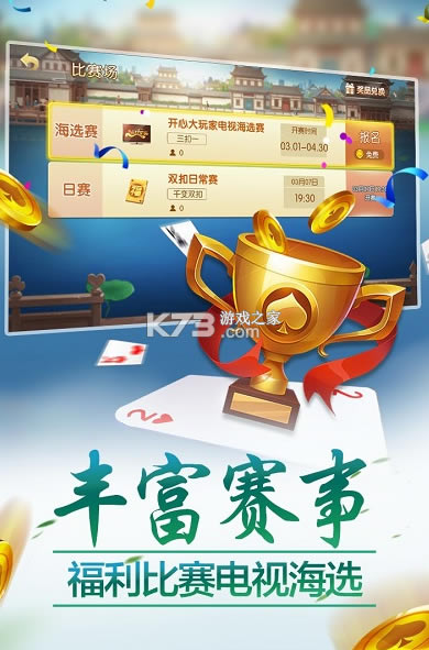 是杭州最为出名的有纸牌游戏之一,在游戏中将采用最为地道的规则主流打法,在游戏中将会有非常丰富的游戏赛事。整个赛事将会采用电视直播的方式进行,在电视中游戏进行海选,确保每一个真人在线对抗。个游戏,操作简单,容易上手,而且整局游戏无需注册,在线进厂后就入座游戏。游戏中将会有非常精美的画质展示,还有风趣幽默的动画表情,十分搞笑的趣味语音。在游戏中有上万的真人玩家在线共同享受欢乐