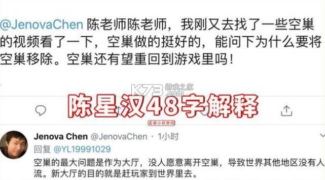 为何突然被删除?关于这个问题,相信大家都想知道。所以,就有玩家忍不住,在推特上找到陈星汉,问他为何突然删除空巢?陈星汉用48个字解释:“空巢的最大问题是作为大厅,没人愿意离开空巢,导致世界其他地区没有人流。新大厅的目的就是赶玩家到世界里去。”原来只是为了分流,把玩家赶到世界。