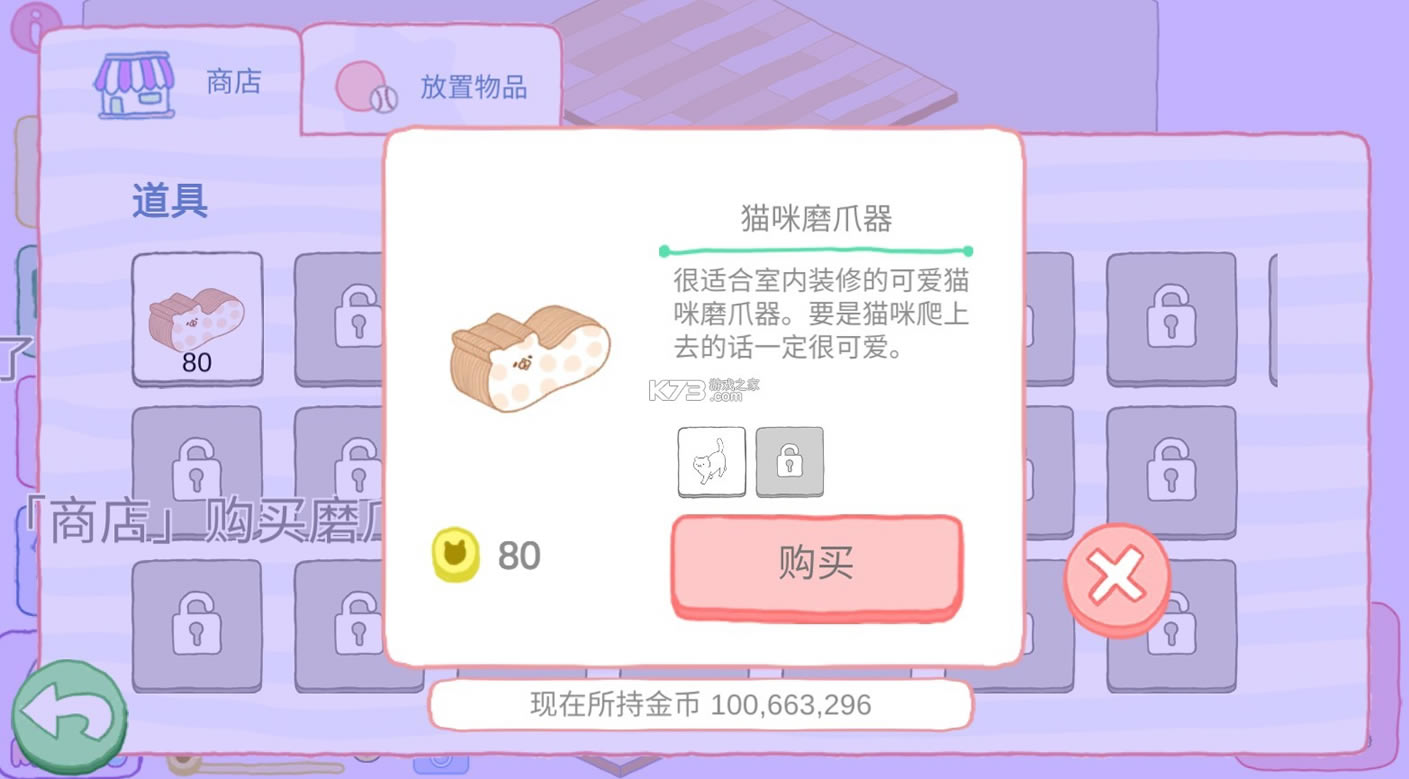 一款安卓放置玩法手游,该游戏中玩家的任务只有养猫,和可爱的猫咪们玩耍,看他们打盹休息睡觉,你还要购买猫抓板等猫咪物品来补充房间设施,来取悦猫咪,而神奇的猫薄荷——木天蓼可以让猫咪兴奋的玩起来。