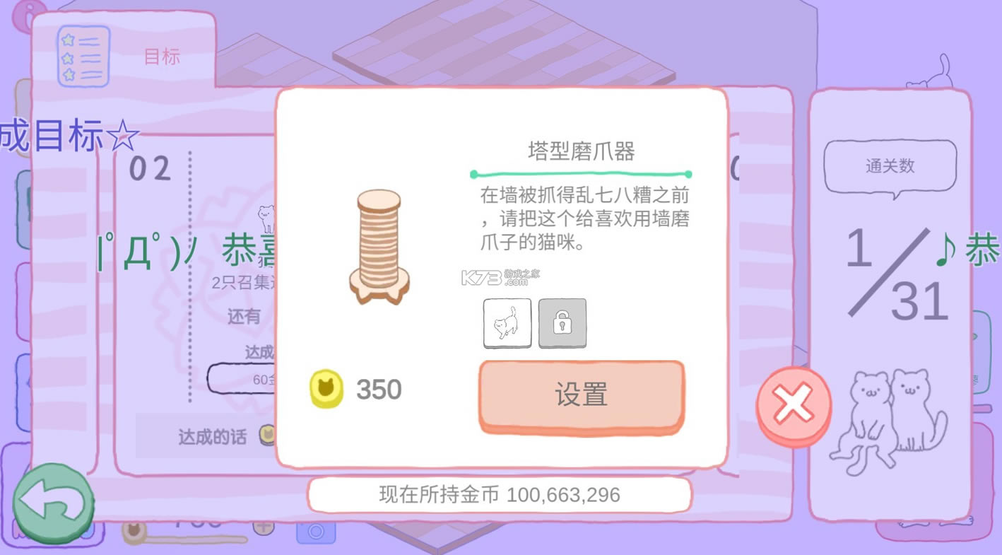 4、简洁的界面设计,轻松愉悦的游戏环境,收集不同的类型的猫咪,缓解你的压力