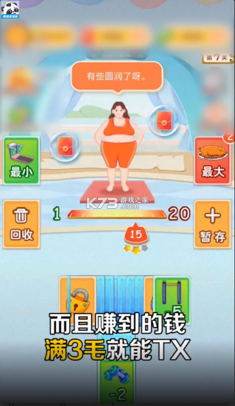 可以赚钱的休闲游戏,主要围绕减肥展开的,画风很是可爱,玩家需要控制自己的体重,完成一系列的任务,成功之后就可以获取奖励,收益蛮多的,适合不同的玩家进行尝试,每天玩一玩,掌握减肥的技巧,收获蛮多的乐趣,老少皆宜,一起行动