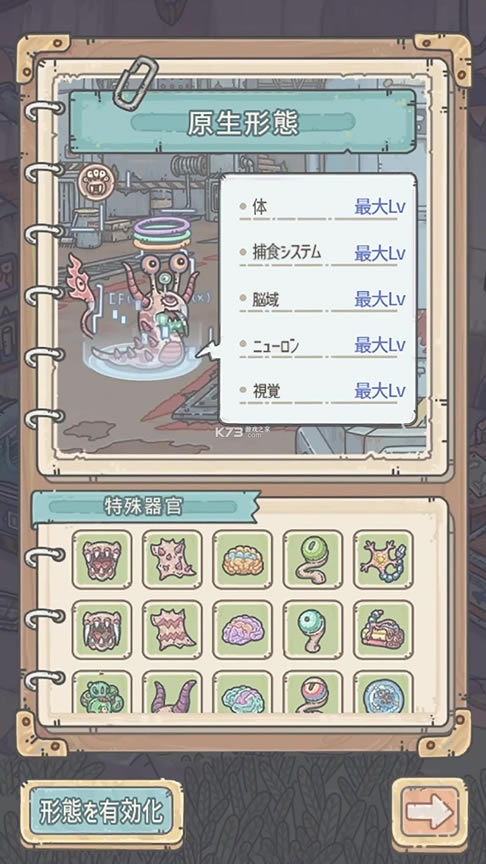 2、进化:肌体进化、捕食系统进化、脑域进化、神经元进化、视觉进化。每一个细节进化,除了能改变各项能力值,还能改变外观,你可以通过不同的侧重点成为一只漂亮的蜗牛,也能雨露均沾成为光头强者