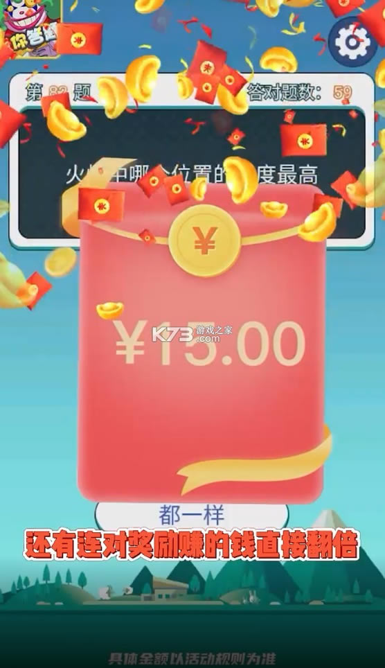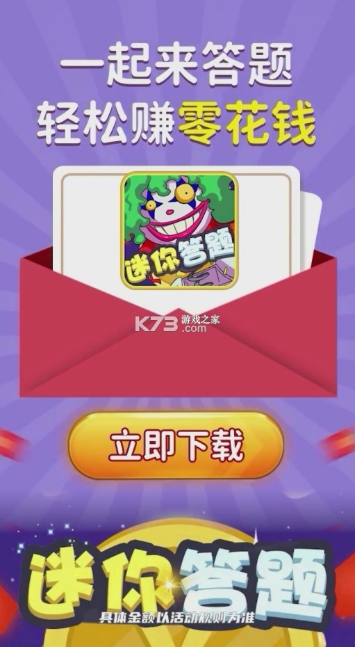 《迷你答题红包版》是一款答题闯关游戏,游戏玩法丰富有趣,还能学到一些小知识,每答对一题都有现金奖励,既能玩游戏又能赚钱,何乐而不为。