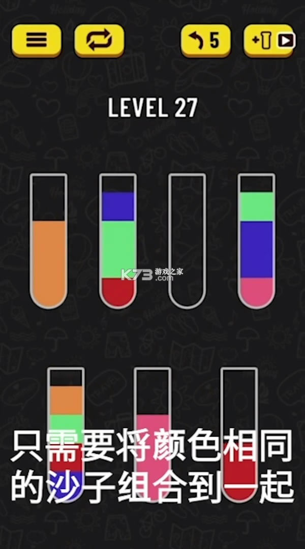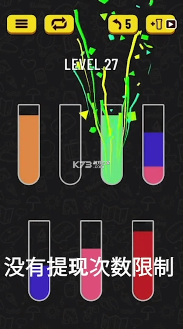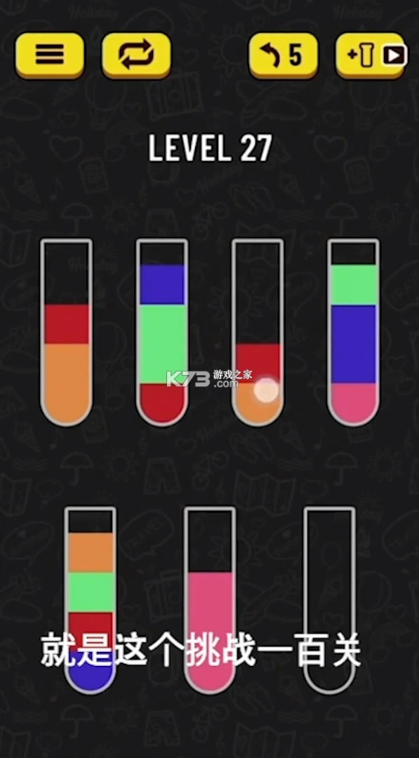 里面有着超多的关卡让大家去挑战,每一关中都会有不同数量的水管,里面混合着无言六色的液体,你需要想办法将里面的液体进行分类,让相同颜色的液体装入同一支试管里面,关卡有几百个