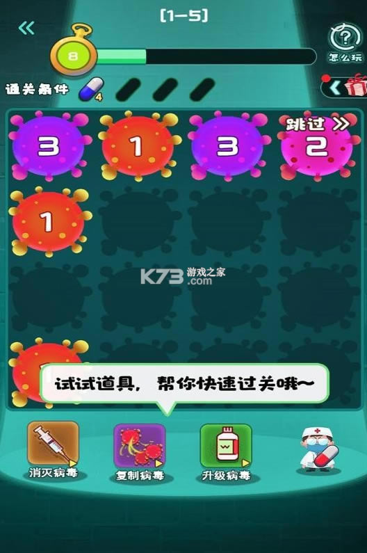 《病毒研究所》是现在非常火爆的休闲小游戏,玩家通过手指滑动移动病毒到达指定等级自动变成疫苗,到达关卡要求后可顺利通关。病毒研究所游戏是一款题材相当有意思的休闲游戏,你将会成为一名研究人员,在秘密实验室中研究病毒。