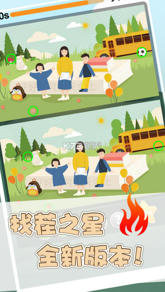 《找茬之星最新版》是一款超级考验眼力和细致的益智找茬小游戏。游戏画面十分卡通,每一局都会出现很可爱的人物,还要考验玩家能否在规定的有限时间找到不同点,顺利进入下一关卡。一起来更小姐姐找茬吧!