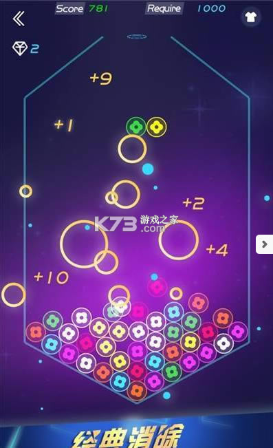 经典消除游戏新玩法,圈圈受重力作用掉下,点击同色的,2个或者2个以上相邻即可消除