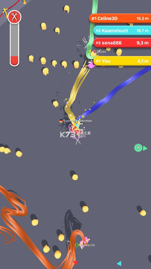 尽可能快地留头发,绊倒其他玩家。用你可爱的卷发夹住它们,先把它们绊倒,或者用剪刀追逐它们。剪剪剪剪!小心你自己漂亮的头发不会被剪掉。
