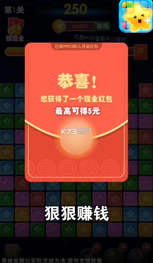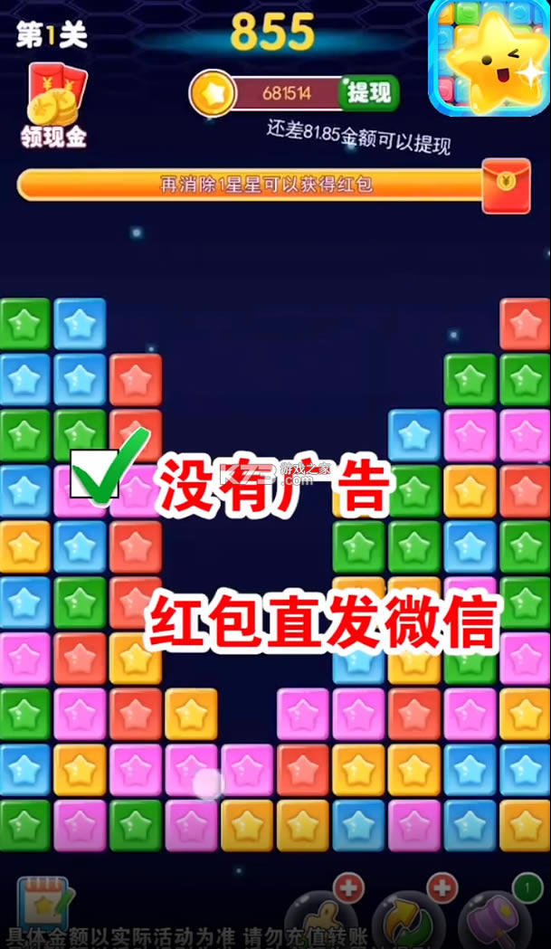 萌星消消赚是一款极具创意的闯关赢红包的手机游戏,游戏采用了全新的Q萌风格,以Q萌的角色和清新的画面风格为特色,玩家在游戏中可以挑战创意性的玩法,还有全新的游戏体验和闯关玩法。更可以在游戏中领取到红包和奖励