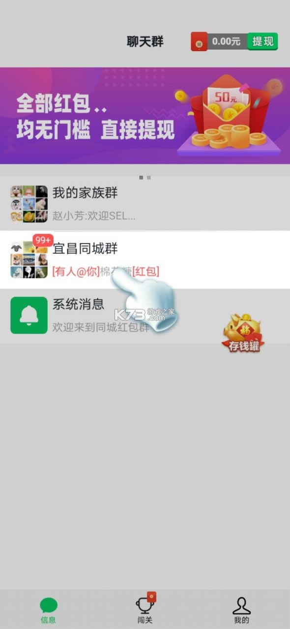 《欢乐红包群》app下载软件是款很火热的红包群赚钱游戏了,能够加入当地的红包群领取更多的红包,有着全民闯关的玩法为你带来更多的红包,每日的提现次数也是没有任何的限制的,可以放心来获得群红包了。