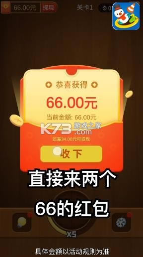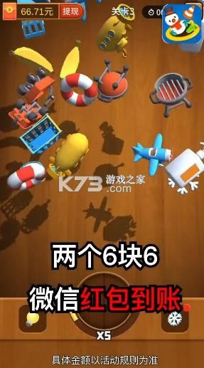 益智类的闯关手游,在关卡中,会出现很多的物体,能够进行相同物品的匹配消除,类似连连看的机制。而且游戏中玩家每次闯关都有一个红包赠送,消除越多红包越多。
