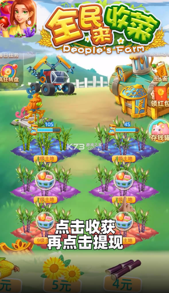 《全民来收菜》是一款真正能赚钱的趣味红包游戏,游戏的玩法大家都不陌生,而且操作也非常的简单老少皆宜,玩家将在游戏中经营自己的农场,种植各种各样的蔬菜,玩家蔬菜的品质越高最后获得的收益也将越高,轻轻松松就来赚到零花钱。
