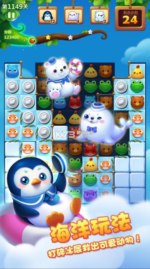 滑动手指让三个及以上的同色小动物横竖相连即可消除,完成每关的指定消除目标即可过关!