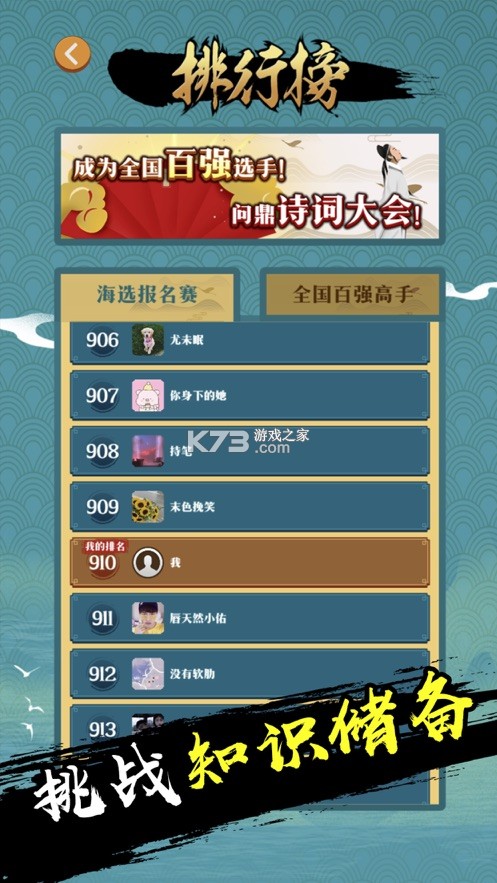 每个场次的竞赛,都会记录您所在排名。无论是地区比赛还是全国比赛,您每次答题都会看到自己的排名提升,成功超越其他选手。您会不会成为全国榜上的那前100名国学高手?