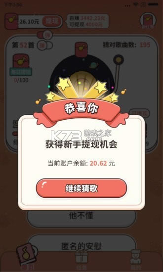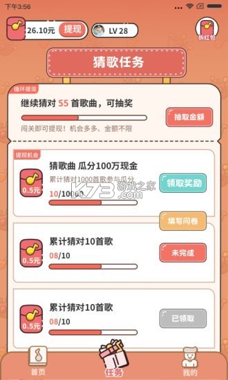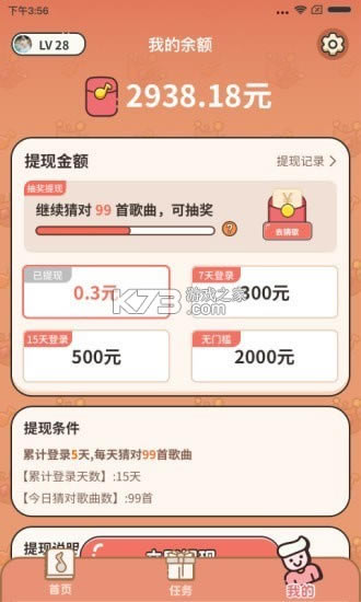 1.根据任务要求开始游戏,猜出一定数量的音乐,获得每日的红包奖励。