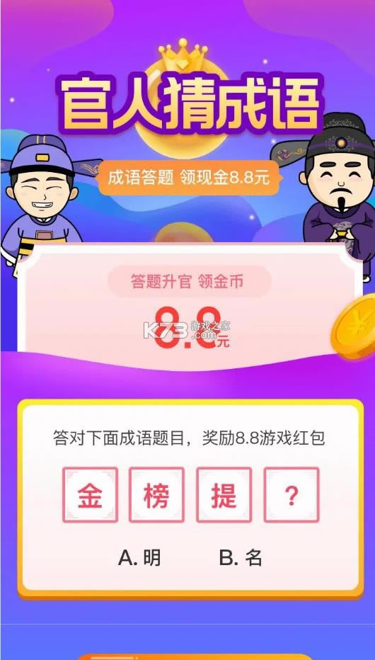 《官人猜成语》这是一款关于成语的一款趣味性的赚钱小游戏,里面有非常多的不同类型的成语,考验玩家对成语的一个掌握,猜对一个成语就可以奖励0.5元钱,简简单单就可以挣午饭钱,非常的不错的。