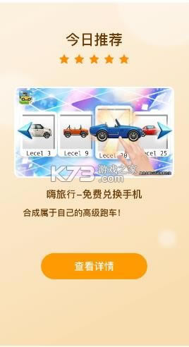 《嗨旅行》这是一款进行汽车合成的一款趣味性的赚钱小游戏,在游戏中里面将非常多的车子,需要将相同的车子进行不断的进行合成,合成的等级越高赚钱越多,还将有机会抽取苹果手机哦,让你轻松玩游戏进行赚收益。