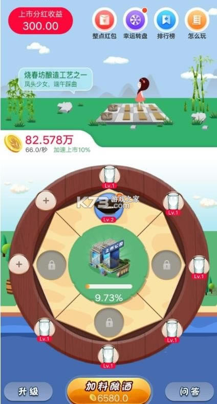 一款8格圆盘风格的合成酒类分红游戏,放入8个瓶子点击“合成”升级;