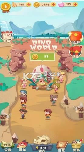 卡通的竖版画风,复古精致的场景,十分可爱的恐龙外观形象,非常的呆萌;