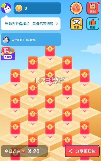 《快抢红包》这是一款可以进行在游戏中轻松抢红包的游戏,游戏非常的简单粗暴,直接在游戏中进行抢红包吧,每天都可以领取20个红包,还可以通过看视频进行翻倍,还有日常的一些小任务,签到推广等都可以赚收益,抢的红包都是可以直接进行提现到账的。